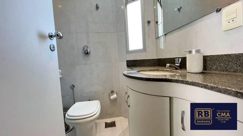 Banheiro social com espelho, bancada em granito, armários e box em blindex