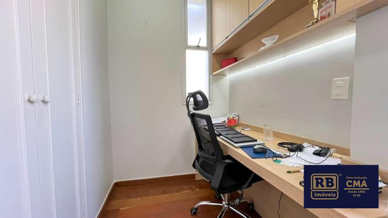2 Quartos amplos, todos com piso em tábua corrida e armários, escritório para home office, sendo uma suíte com espelho, bancada em granito, armários e box em blindex