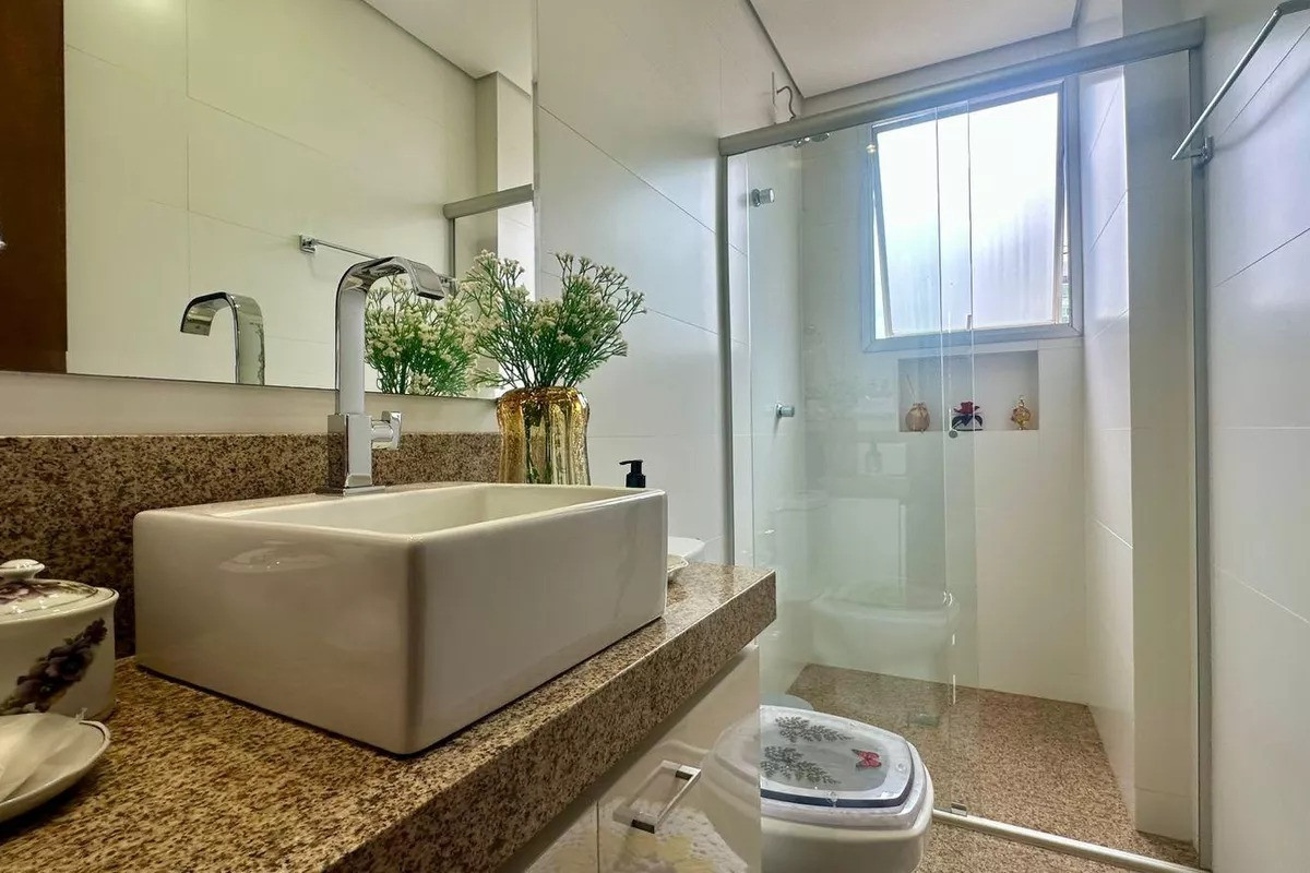 Banheiros (suíte e social) com acabamento de qualidade, armários planejados e box em blindex.